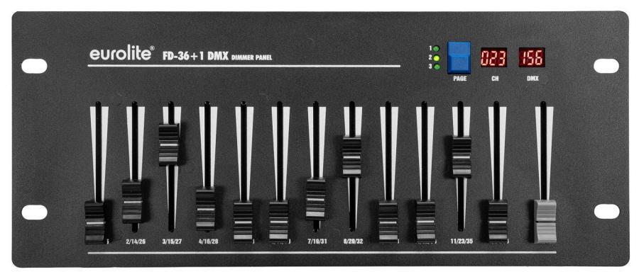 - 12 channel faders for adjusting the DMX values in 3 groups